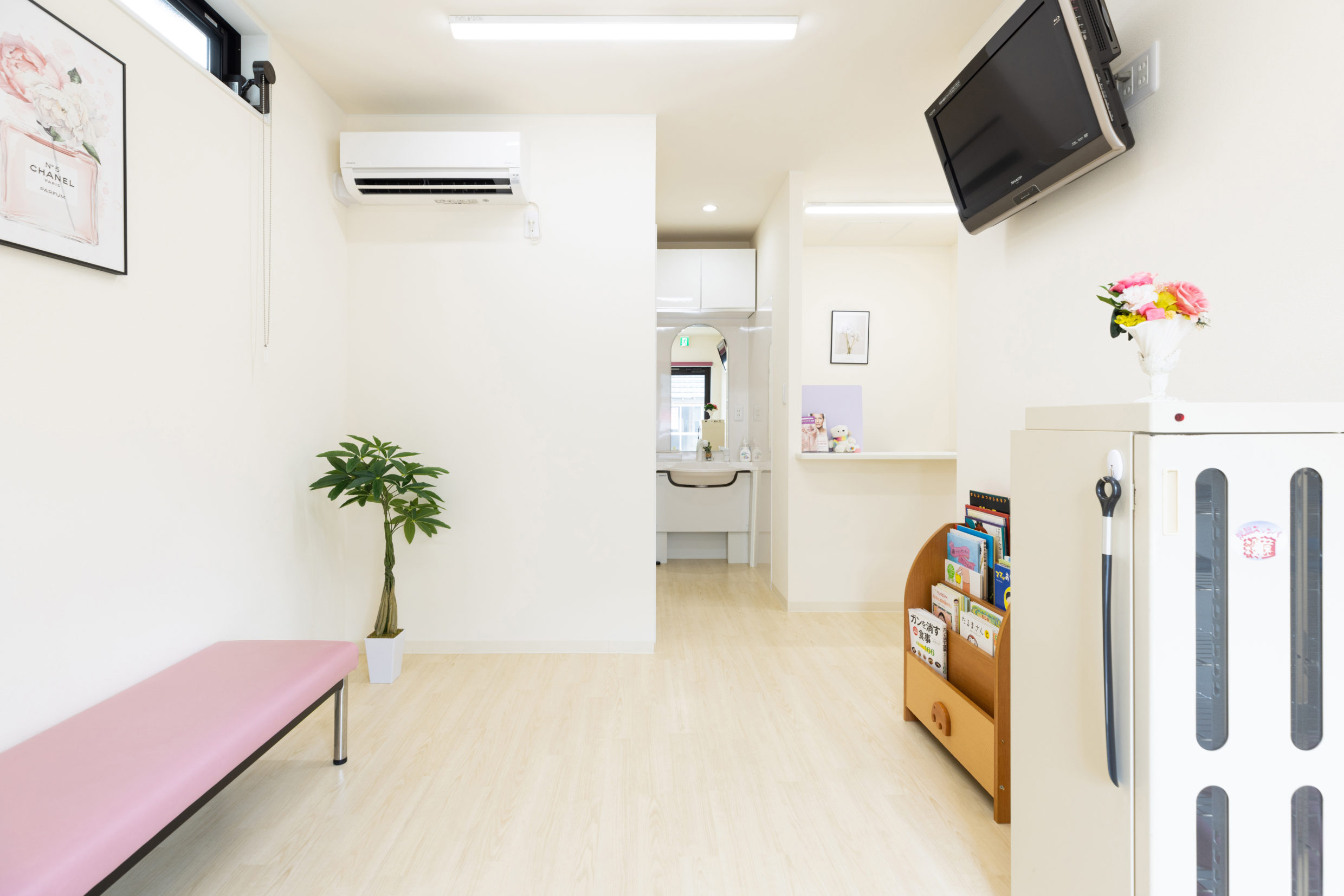 院内は白とピンクを基調としたやわらかい雰囲気の診療室になっており、やさしさとあたたかみのある「地域の歯医者さん」です。
